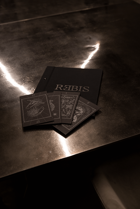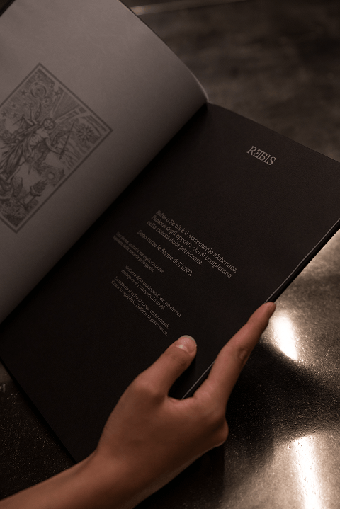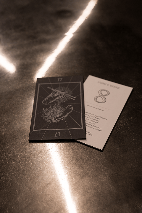 The menu translates this vision into an editorial object: a card-based format conceived as a deck to be handled, discovered, and recomposed. Typography and illustration extend the same symbolic language, turning reading into part of the ritual — tactile, intimate, and restrained.